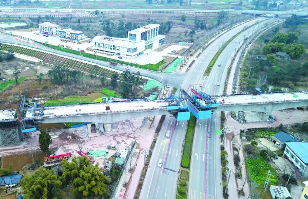 2月17日,记者在成达万高铁南充嘉陵江特大桥引桥上跨顺蓬营一级公路主跨连续梁浇筑现场看到,长100米的主跨迈入合龙施工阶段。 四川公路桥梁建设集团有限公司成达万高速铁路工程指挥部相关负责人介绍,春节后,工人们按时返岗复工,抓紧时间抢工期、抓进度,项目建设有序推进,预计主跨合龙施工将于4月中旬全部完成。 南充市融媒体中心记者 余中华 摄影报道