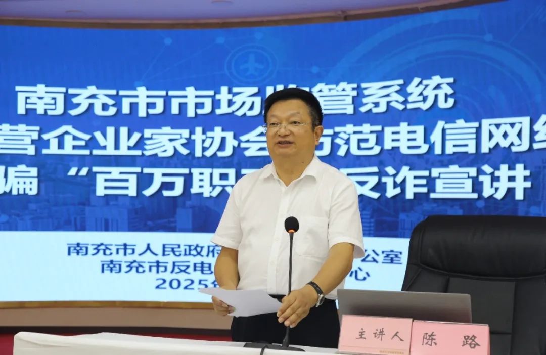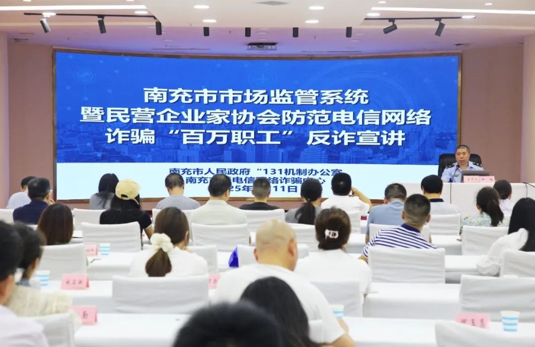 为深入贯彻“全民反诈在行动”集中宣传月工作部署,7月11日上午,南充市市场监管局与市民营企业家协会联合召开防范电信网络诈骗“百万职工”反诈宣讲会。南充市公安局刑侦支队副支队长陈路通过“问题互动+答疑解惑”的宣讲模式,为80余名市场监管干部及民营企业家代表带来生动实用的反诈知识培训。守护企业“钱袋子”