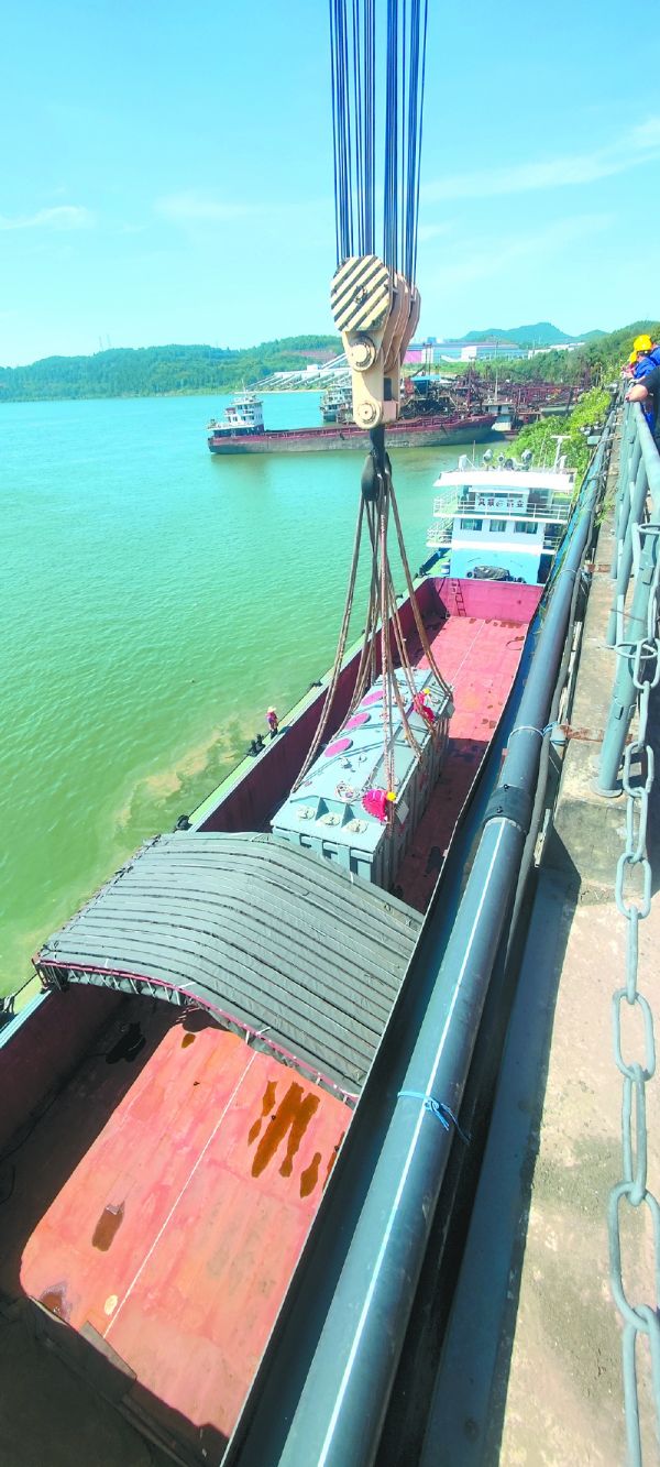 从秦皇岛港运抵南充的变压器,在南充港河西作业区大件运输码头吊装上岸