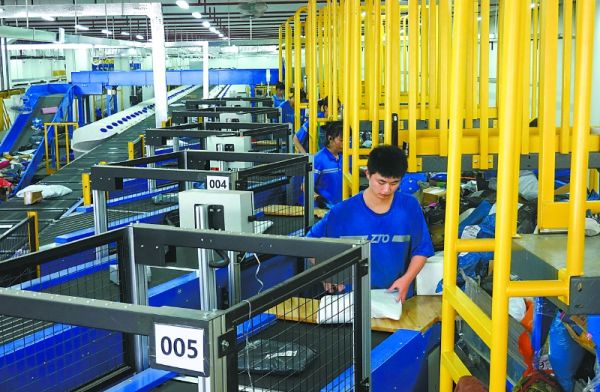 中通快递南充转运中心分拣车间,员工与智能设备协同作业。南充市融媒体中心记者 梁洪源 摄