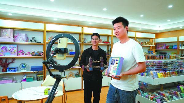 在产品展示间,种类繁多的文创产品摆放在展示柜上。火漆印章系列产品占据醒目位置,随之是木质音乐盒、木质拼装玩具等各式木质工艺品。在公司的直播间内,主播正手持各类火漆印章,现场演示操作过程,直播间评论区互动频繁。“国内消费者喜欢花草、传统建筑、汉字这类中国元素,定制火漆蜡标贴很受欢迎,轮廓、尺寸、图案都可以按需定制,是我们淘宝店铺最畅销的商品。”蒲思龙拿起一枚刻有中国古建筑图案的印章和一封贴着定制火漆蜡封的请柬说,“而销往欧美的产品,更多会采用英文字母、独角兽、皇冠等当地消费者喜爱的图案。”