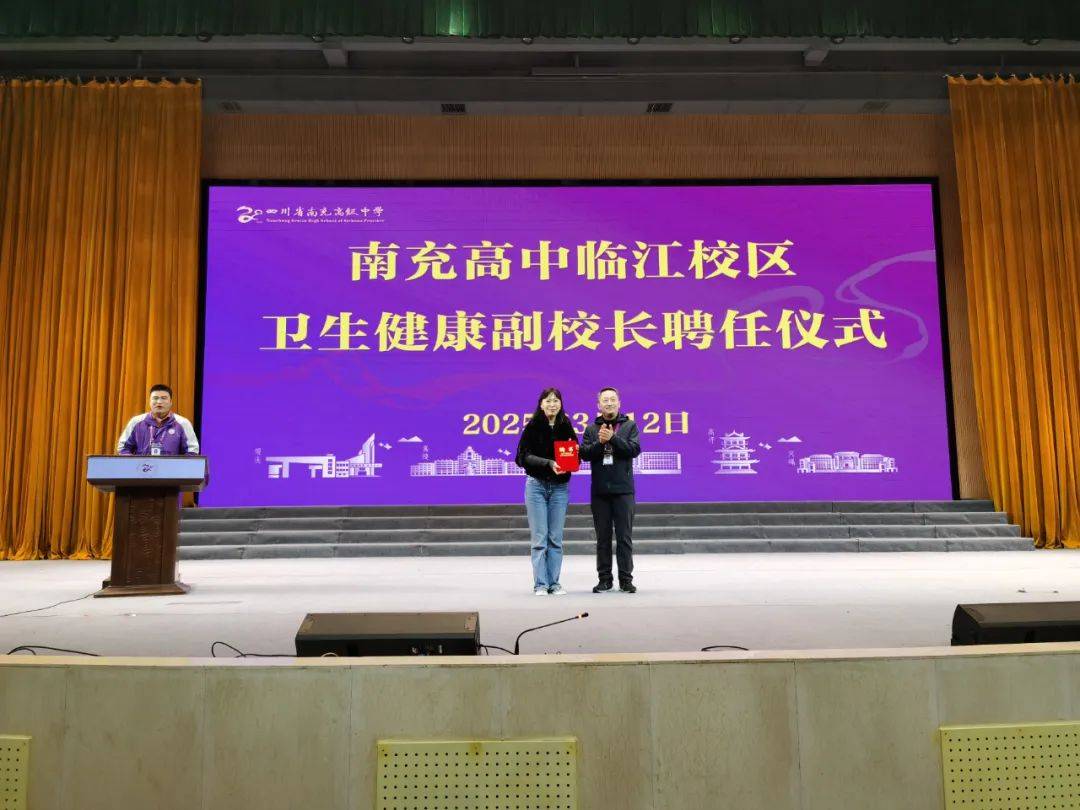 陈祺文主席为沈静院长颁发“四川省南充高级中学临江校区卫生健康副校长”聘书。沈院长从南高毕业多年,依旧心系母校发展,她表示将认真履行职责,充分发挥专业优势,为师生们营造更加健康、安全的学习和生活环境。