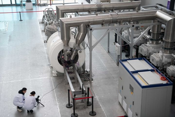 科研人员在位于安徽省合肥市的聚变堆主机关键系统综合研究设施(CRAFT)园区内记录强流直线等离子体装置“赤霄”的运行状态(2025年1月14日摄)。新华社记者 张端 摄
