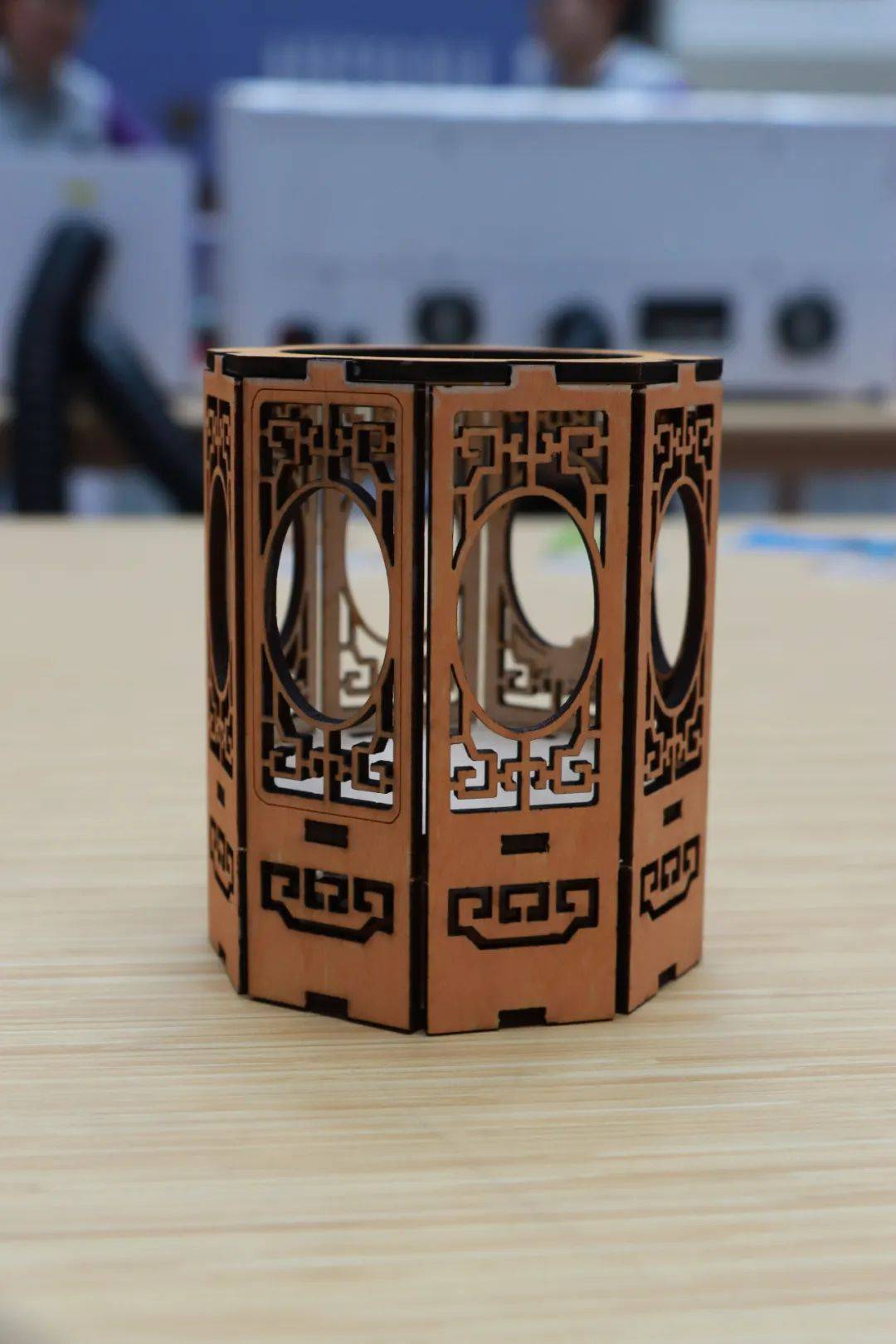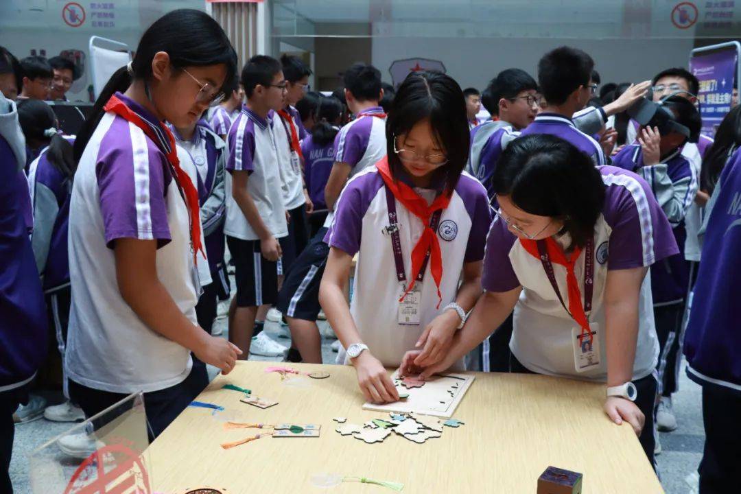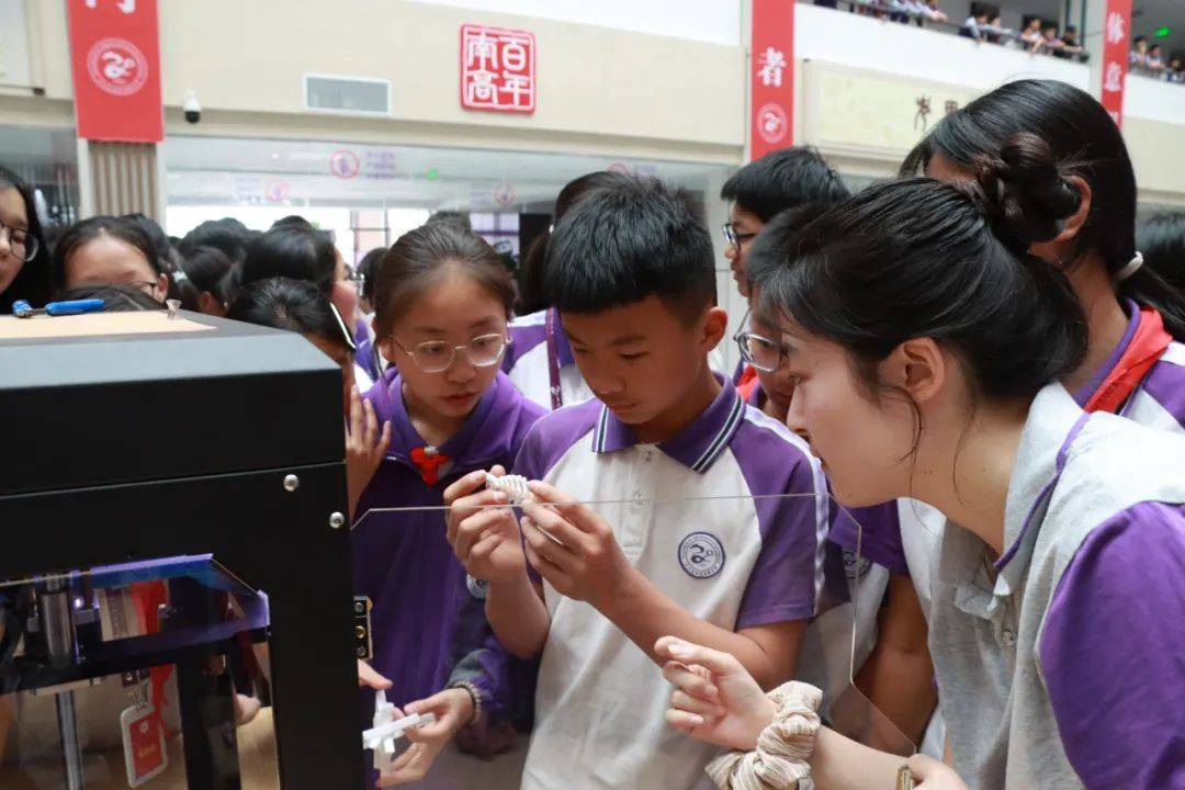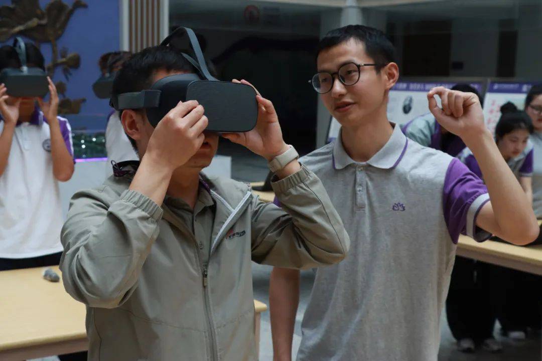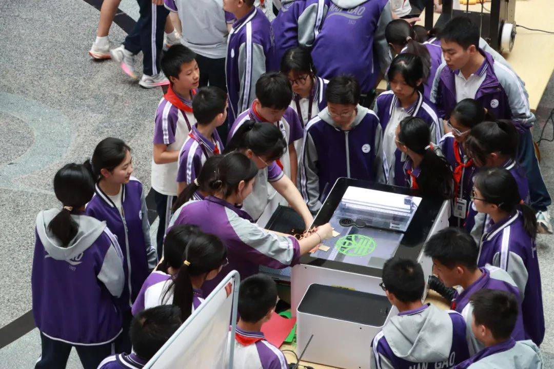 展区布局合理,各功能区域特色鲜明。3D打印区实时演示立体模型从数字设计到实体成型的奇妙过程,让同学们直观感受到数字化制造的神奇魅力;激光切割区则展示了高精度技术如何将设计图纸转化为精美的木质或亚克力艺术品,精巧的工艺引得师生们纷纷驻足赞叹;VR眼镜体验区人气爆棚,同学们戴上设备便能沉浸式遨游虚拟世界,开启一场奇妙的冒险之旅;Mind+图形化编程区宛如一个“创意实验室”,同学们通过简单的拖拽模块就能轻松完成动画与游戏设计,进一步点燃了他们对编程的热情。