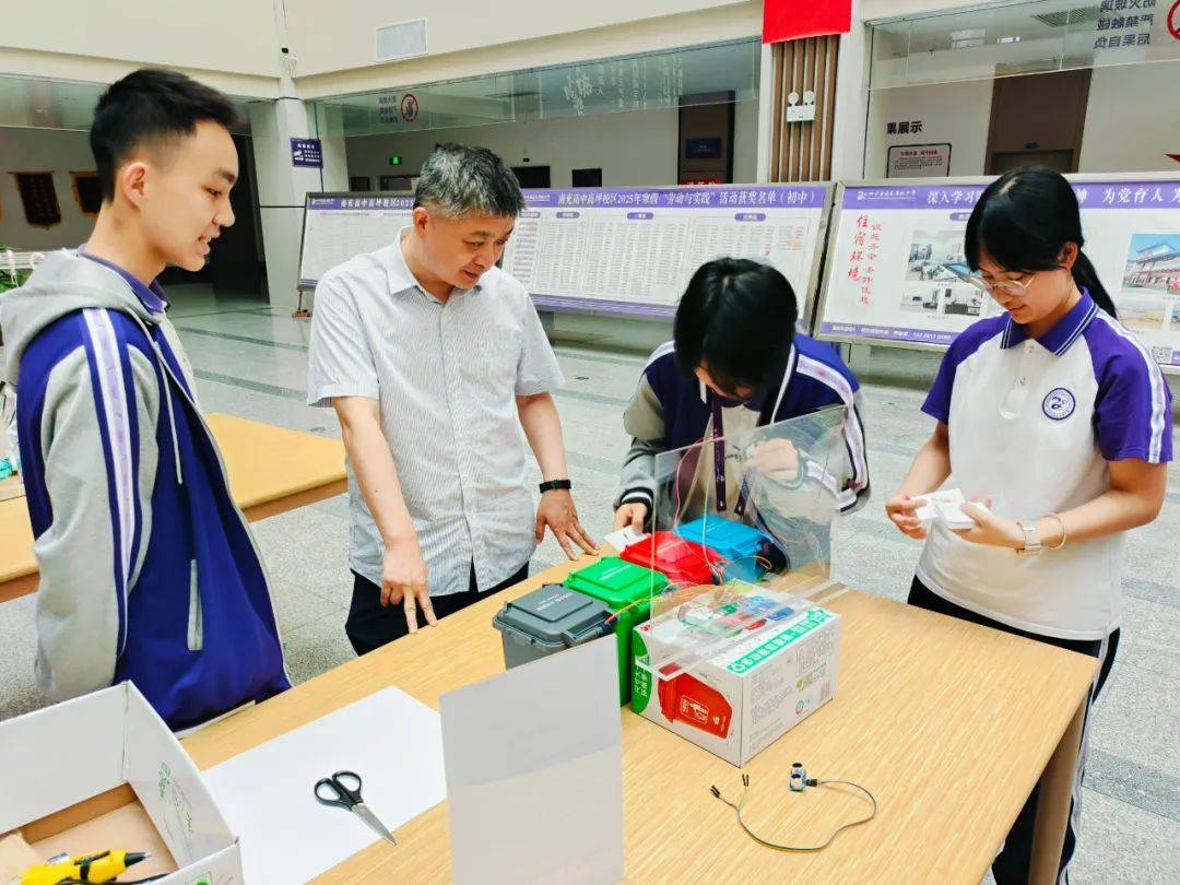 智能语音垃圾站的设计者、初三(10)班的蒋锐锋同学分享了创作历程,他表示从电路焊接失败到模型成功运转,期间经历了数十次的调试,每一次失败都是向成功迈进的一步。据指导教师彭毅介绍,所有项目都历经3个月的研发周期,学生们全程参与资料检索、结构设计、程序编写等各个环节,在实践中不断提升自己的能力。物理教研组开设的创客工坊,通过项目制学习模式,有效培养了学生的跨学科思维,为他们的未来发展奠定了坚实的基础。阳建辉老师的国家专利作品“智能灌溉系统”展示更是极大鼓舞大量同学对科研的探索。