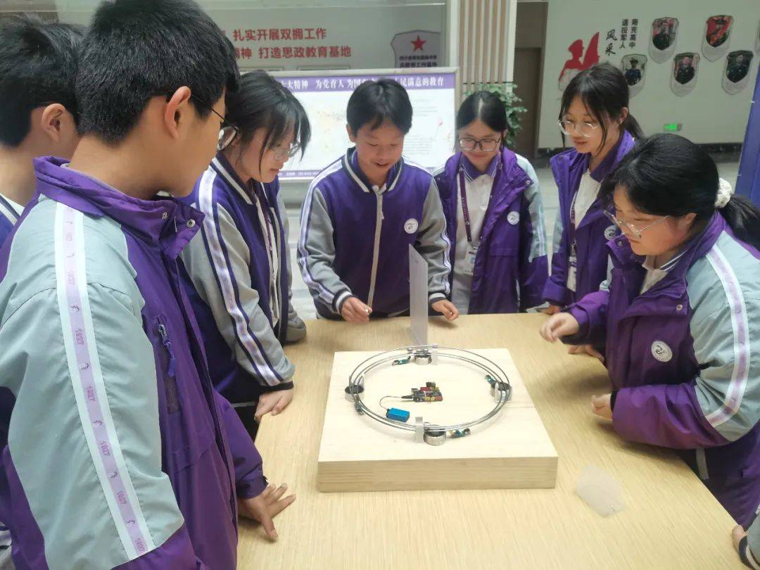活动现场的互动体验环节备受师生欢迎。观众们可以亲手操作电磁加速器投掷硬币,感受物理的神奇力量;组装纸电路明信片,将创意与科技完美结合;与人工智能机械狗“小智”互动,体验科技带来的乐趣;还可以佩戴电弧发生手套,感受物理魅力的同时,留下难忘的回忆。南充高中党委副书记张莉梅在参观时强调:“科技文化艺术节不仅是创新成果的展示舞台,更是学生核心素养的培育阵地。当麦克斯韦方程从书本走向实践,化作指尖跃动的电磁火花,教育的本质价值便得以生动彰显。”