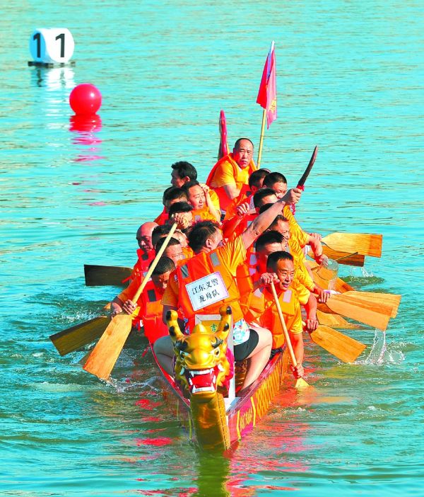 江东义警龙舟队在表演赛中激情高涨