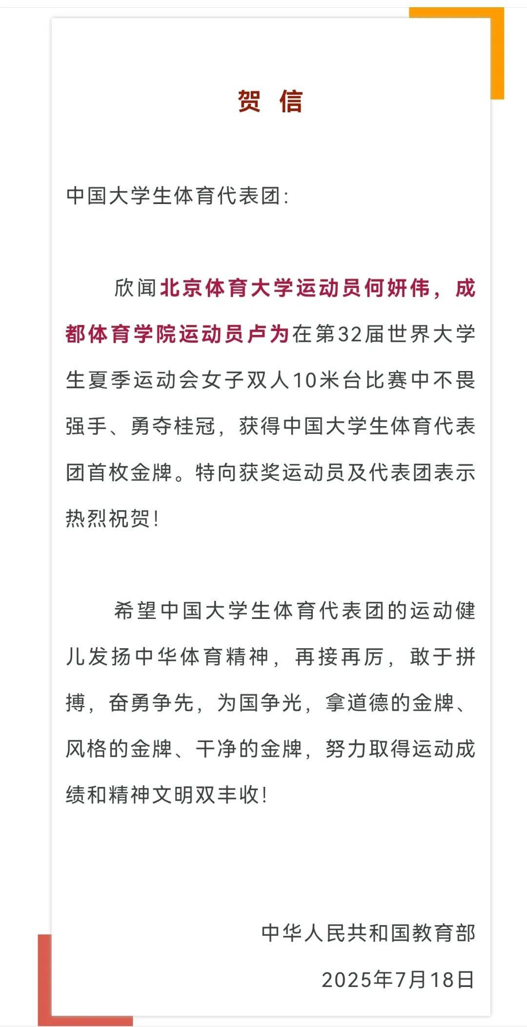 当地时间7月17日,在2025年大运会跳水女子双人10米台决赛中,南充高中校友卢为与北京运动员何妍伟夺得中国大学生代表团在本次大运会的首金!