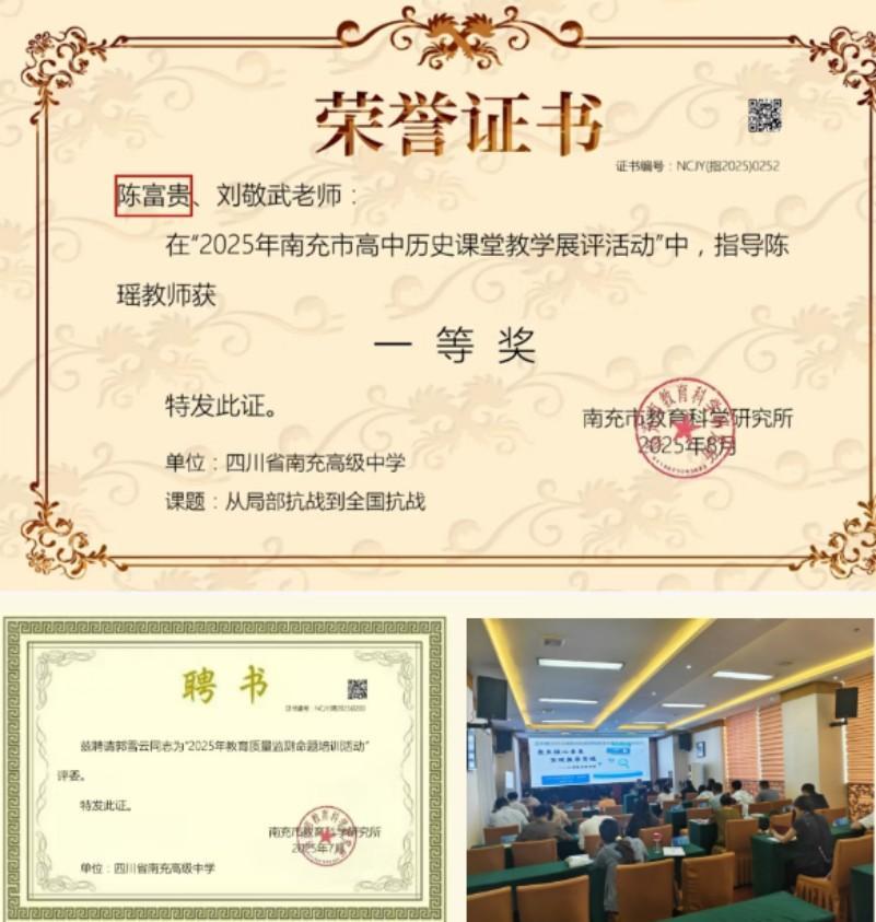 为落实学校“名师领航工程”要求,工作室进一步发挥示范、引领和辐射作用。2024年8月,工作室指导新进教师陈瑶参加新教师岗前试教活动,助力其快速站稳讲台;2025年5月,研究员陈富贵老师指导陈瑶老师参加“2025年南充市高中历史课堂教学展评活动”获一等奖。2025年7月,研究员郭雪云老师被南充市教科所聘请为“2025年教育质量监测命题培训活动”的评委,在四川省2025年民族地区教师转型专业能力提升培训项目作专题讲座。