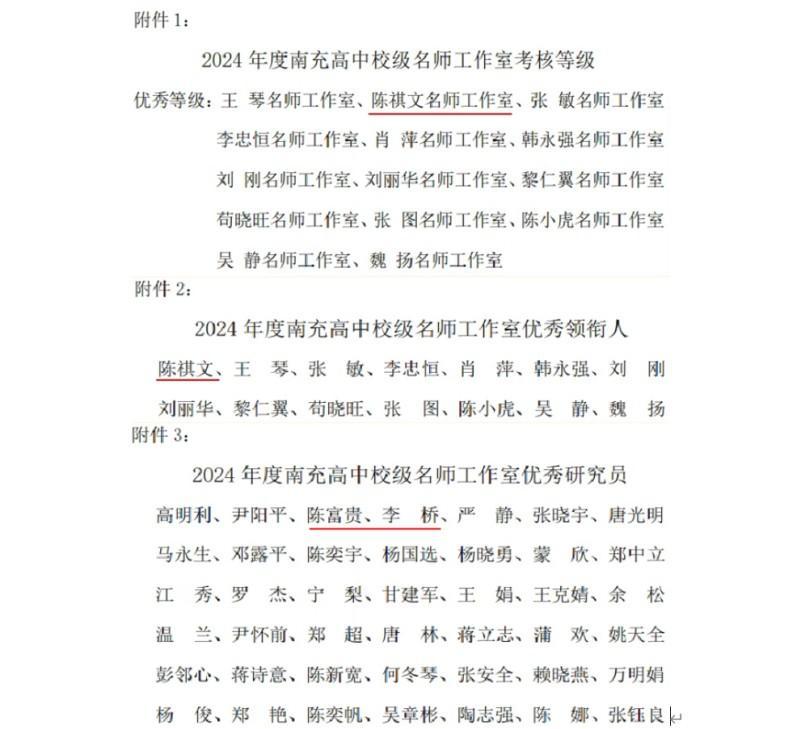 考核优秀显实力,凝心聚力再出发。据四川省南充高级中学关于2024年度校级名师工作室考核结果显示,工作室获评“优秀”等级,陈祺文老师获“优秀领衔人”荣誉,陈富贵老师、李桥老师获“优秀研究员”荣誉,梁家荣老师、乔璇老师获“优秀成员”荣誉。
