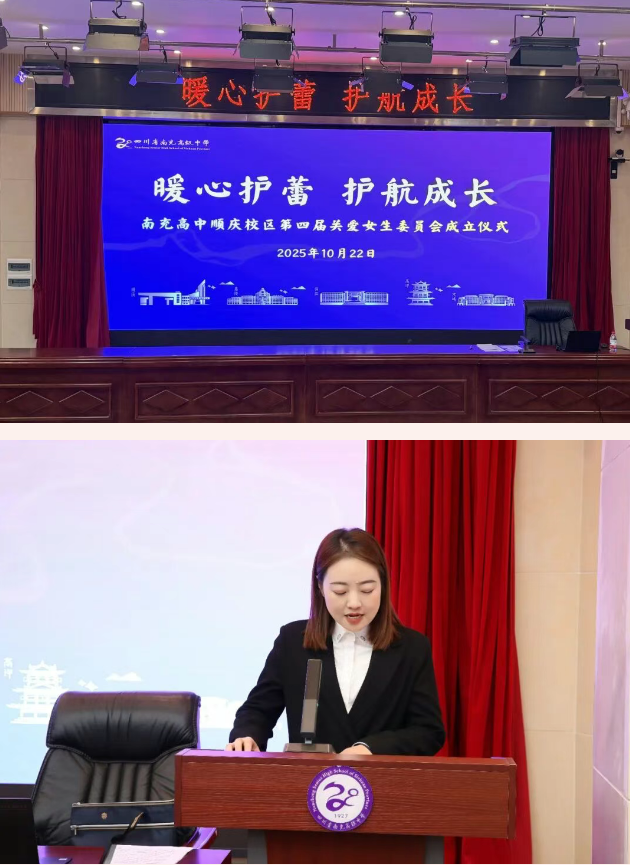 仪式上,顺庆校区副校长周莉宣读了《关于成立南充高中顺庆校区第四届关爱女生委员会的工作方案》。南充高中顺庆校区“关爱女生委员会”委员主要由校级领导、女中层干部、女班主任、心理教师及各班女学生委员(女心理委员或安全委员兼任)组成,旨在引导女学生树立自尊、自爱、自信、自强的价值观,保障未成年女生身心健康发展,助力各项“关爱女生活动”的有效开展和落实。