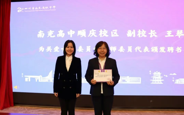 顺庆校区副校长王琴为关爱女生委员会教师委员代表徐虹老师颁发聘书。