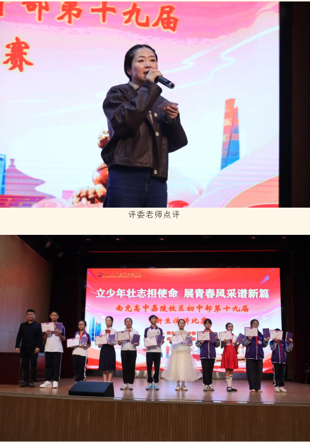 此前,各班通过语文老师与班主任组织的初赛,分别选出1名优秀代表晋级决赛。决赛当天,选手们精神饱满、意气风发。景奇瑀以《南高燃壮志,少年谱新篇》开篇,点燃现场氛围;赵钰沫《以少年之志赴使命,以青春之我谱新篇》、任沐洋《铭记历史立壮志,青春担当谱新篇》等演讲,紧扣主题,结合自身与校园生活,诠释少年使命;罗梓心《嘉陵江畔的少年诗行》以诗意语言展现地域情怀,莫非默《肩明月清风,担家国天下》则彰显家国担当……