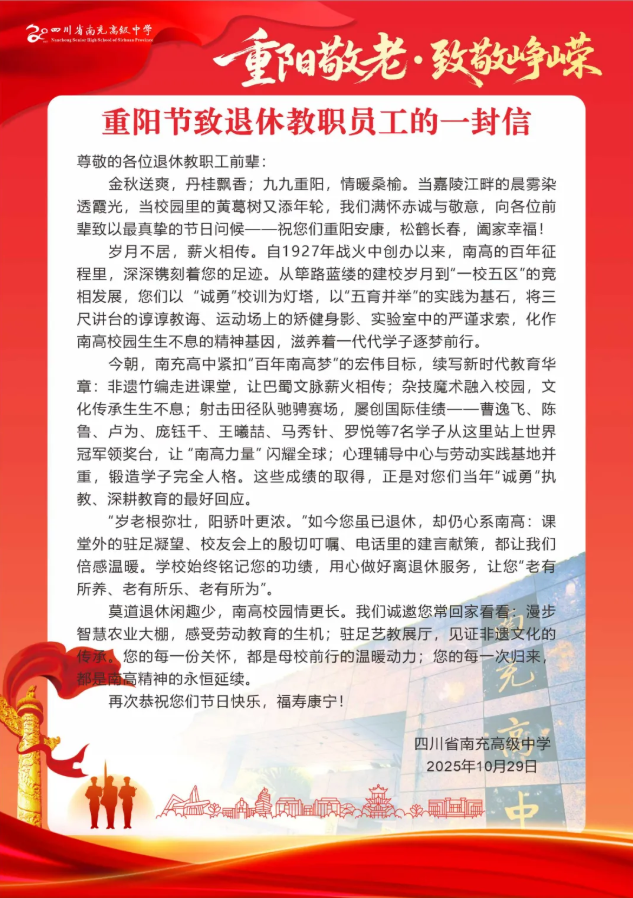 此次重阳节主题活动,不仅让退休教职工真切感受到学校的关怀与温暖,更搭建起学校与老教师之间情感联结、精神传承的桥梁。未来,南充高中将持续延续敬老爱老传统,常态化开展此类活动,携手退休教职工共同推动学校高质量发展。