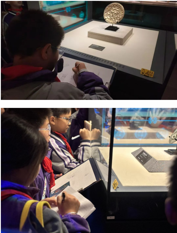 随后,同学们在“岁时淳风”展厅领略了本土民俗魅力,“亮花鞋”的精美绣样、“送蛴蟆”的民俗场景复原,让大家对南充特色节庆文化有了直观认知;在互动区,大家还触摸了嘉陵剪纸复制品,感受非物质文化遗产的传承温度。整个过程中,同学们不时记录文物尺寸与背后故事,在提问与聆听中深化了对家乡历史的理解。