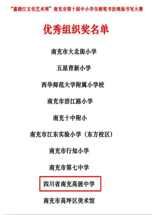 实力领跑!南充高中在南充市第十届“嘉陵江文化艺术周”硬笔书法大赛斩获 41 项大奖,高中组包揽全市金奖!
