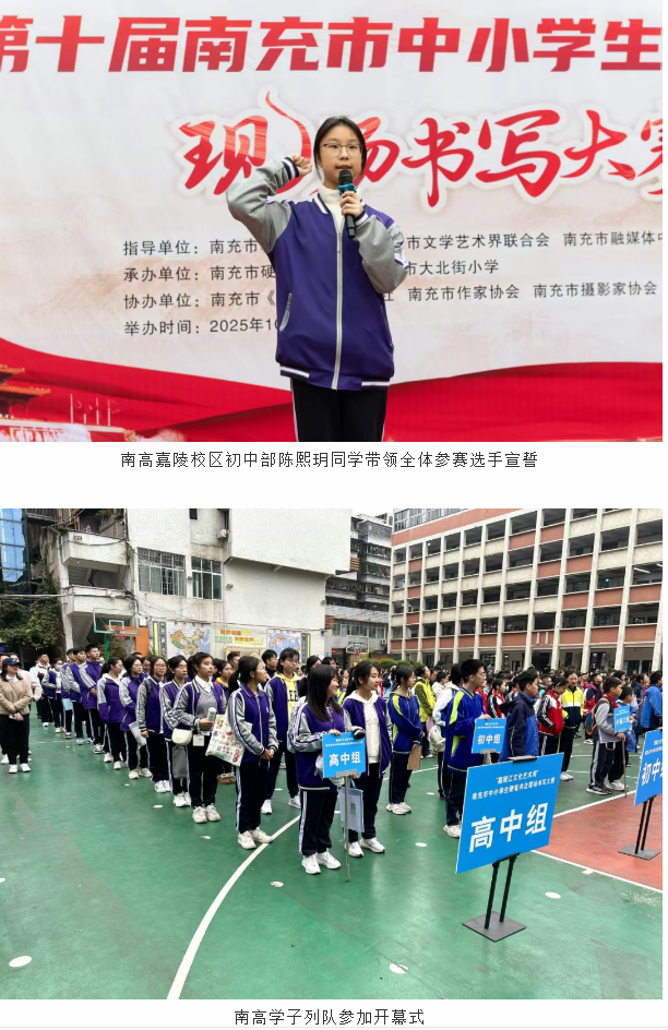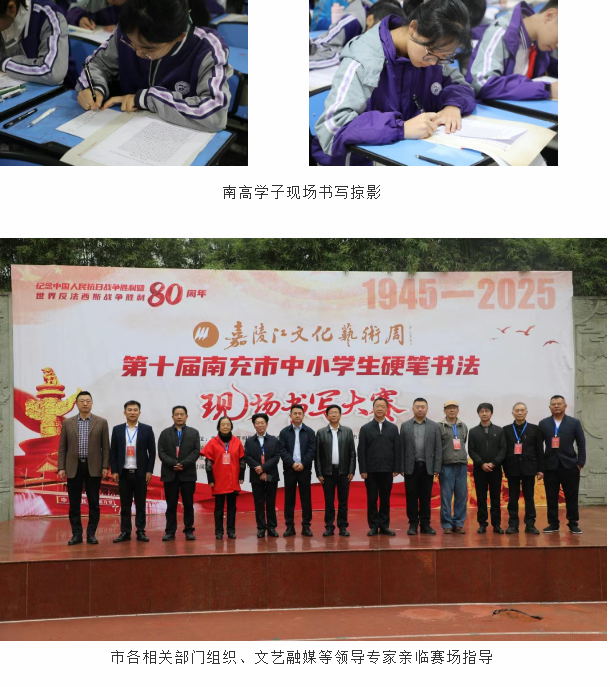 金秋送爽,墨韵飘香,10月26日,南充市第十届中小学生硬笔书法现场决赛于大北街小学隆重举行。大赛由南充市文联、市教体局、共青团南充市委、市融媒中心等多部门联合主办,这场汇聚全市书法新秀的文化盛宴,不仅为中小学生搭建了展示书写才华的平台,更以笔墨为纽带,让中华优秀传统文化在青少年心中深深扎根。在潘大强、陈玲、黄欣三位老师的指导下南高学子积极参与,凭借扎实的书写功底斩获41项大奖,高中组包揽全市金奖,南充高中获“优秀组织奖”。