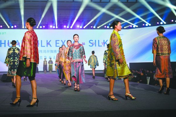 11月21日,2025四川丝绸博览会·丝纺时装发布走秀活动现场,模特尽情展示丝纺时装之美