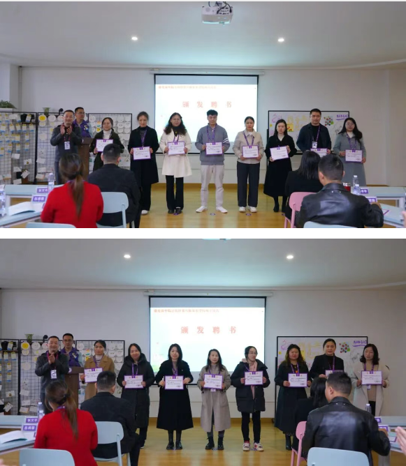 工会主席陈祺文为高中家长学校委员颁发聘书。