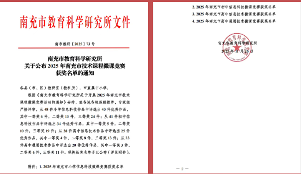 近日,2025年南充市技术课程微课竞赛结果出炉,我校教师凭借扎实的信息素养与创新实践能力脱颖而出,斩获三项市级一等奖。