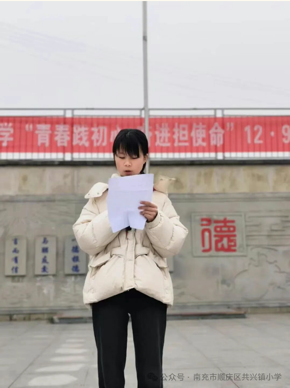 她结合时代与家乡的发展,发出号召:“如今科技竞争、乡村振兴需要青年力量,共兴镇的田野上也有青年干部的坚守。作为初中部学生,让我们把12·9的热血,变成课堂上的笔耕不辍、对学弟学妹的榜样引领,用共兴少年的奋进,托举明天的中国!”