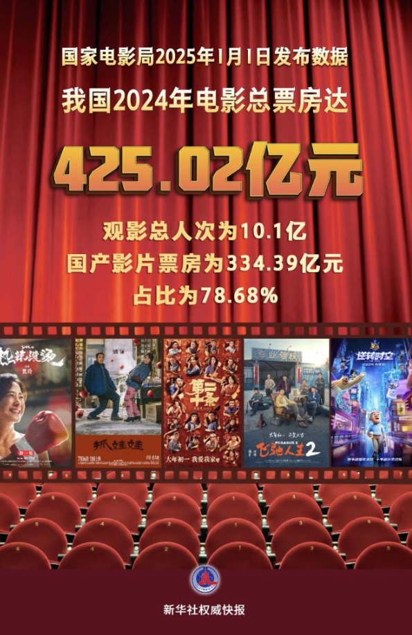 国家电影局2025年1月1日发布数据,我国2024年电影总票房达425.02亿元,观影总人次为10.1亿。