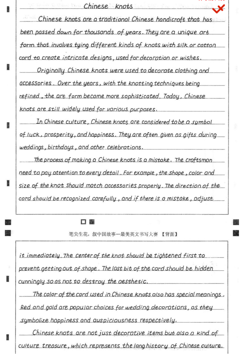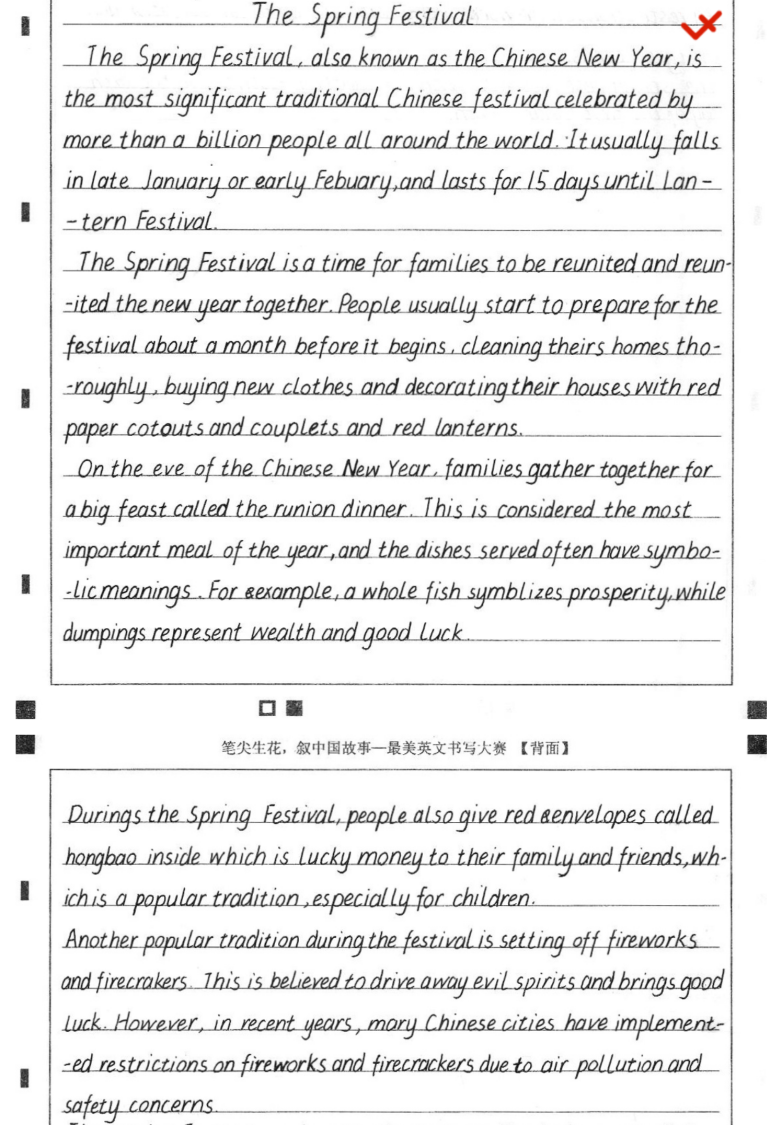 赛场之上,同学们不负期待交出了一份份令人惊艳的答卷:字迹工整舒展,笔画遒劲有力,英文字母的韵律感与中文意蕴的厚重感完美交融;字里行间既展现出扎实的英文书写功底,更流淌着对中华文化的深刻理解与真挚热爱,每一张作品都是跨越语言的文化对话,每一笔勾勒都是青年学子对文明传承的生动诠释。