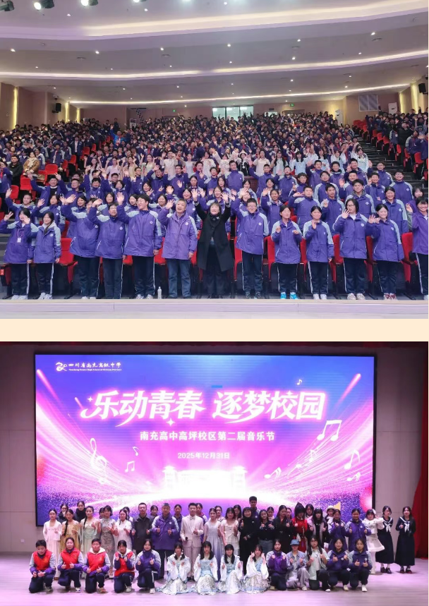 2025年12月31日,南充高中高坪校区莲池厅内旋律飞扬,第二届“乐动青春,逐梦校园”校园音乐节在这里精彩上演。南充高中党委副书记张莉梅、高坪校区副校长张图出席活动,与七百余名师生共同沉浸在这场充满青春气息的艺术盛宴之中。