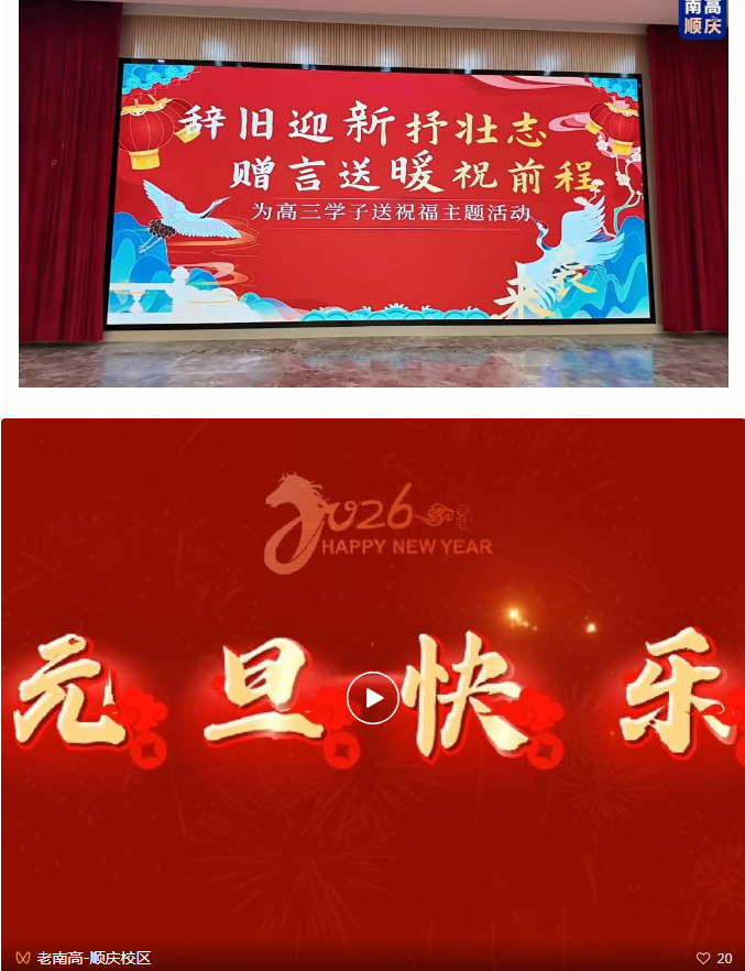 辞旧迎新启新程,温情护航助备考。2025年12月31日,南充高中顺庆校区与临江校区分别精心策划开展特色辞旧迎新活动,以不同形式为高三学子缓解备考压力、提振冲刺斗志,传递校园温情与团结力量,让学子们在温馨氛围中告别旧岁、迎接新年。