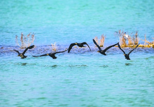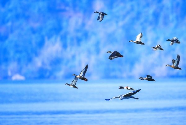 白眉鸭、斑嘴鸭、翘鼻麻鸭、苍鹭等翩跹起舞