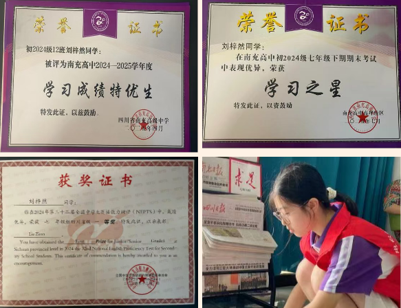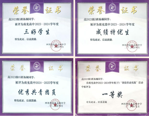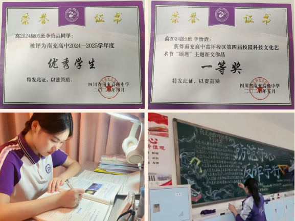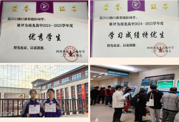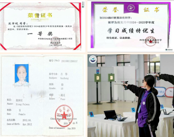 优秀事迹:以“挑战自我,追求卓越”为信条,学习刻苦自律,持续探索高效学习方法。擅长射击与古筝,在“星火杯”2025年四川省青少年锦标赛女子甲组10米光电手枪60发项目中荣获第三名;在共青团四川省委、四川省教育厅等联合主办的“2025年四川青少年文化艺术展演(舞台艺术类·古筝)”中获三等奖;在《绽放的向阳花》2024全国青少年美育成果展演南充分展区中获古筝类一等奖;已取得中国音乐家协会古筝专业十级证书。立志成长为有专长、有创造力的复合型人才,为服务国家与社会积蓄力量。