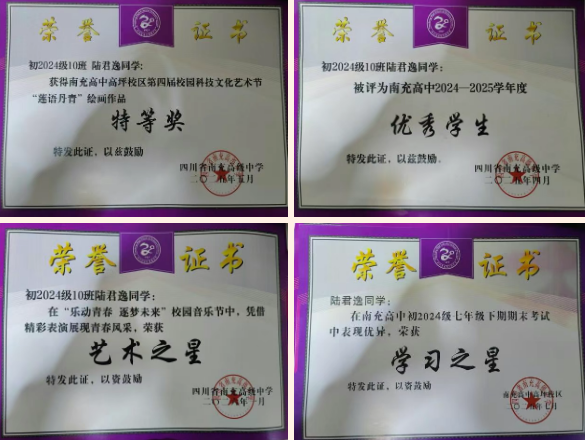 优秀事迹:学习能力突出,基础扎实、学法高效,新知识吸收快、运用活,历次考试成绩稳居前列。乐于分享学习经验,带动同学共同进步,营造积极向上的班级学风。兼具扎实文化功底与出色艺术素养,在“莲语丹青”绘画比赛中以细腻笔触与独特视角斩获特等奖,在校园音乐节上凭精彩舞台表现获评“艺术之星”,以多元才艺展现青春风采。对待学业与班级事务认真负责,主动担当、团结同学;恪守“弘扬诚勇 追求卓越”校训,热心志愿服务,用行动传递温暖与正能量。未来将继续锐意进取,在学业与艺术领域不断突破,以更优表现回馈师长与集体。