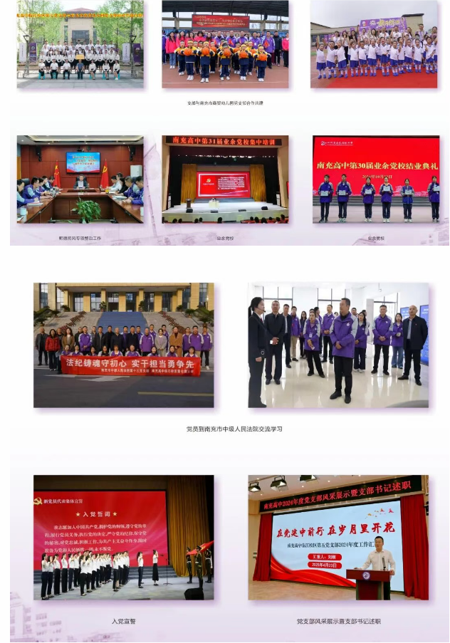 南充高中临江校区在学校党委的政治引领和统一部署下,坚持举旗定向,凝心聚力,将党的领导贯穿于校区教育教学与管理的全过程。五年来,根据学校党委制定的《关于加强党建工作的实施意见》等文件精神,校区积极参与学校意识形态工作大会、宣传思想工作大会、统战工作大会、党风廉政建设专题会。坚持“133”党建工作思路和“1+2+3”学习法,将习近平新时代中国特色社会主义思想融入立德树人全过程,充分挖掘学校红色资源有效融入思政课堂,引导广大青少年传承红色基因,厚植爱党爱国情怀。推动党史学习教育常态化、特色化开展,并将学习成果转化为“我为群众办实事”的实际行动。 将党纪学习教育与师德师风建设紧密结合,引导广大教师以教育家精神为标准,争当“四有”好老师,严守职业底线,弘扬新风正气。深入贯彻中央八项规定精神学习教育,持续改进工作作风,努力营造风清气正的育人环境,为实现“百年南高梦”贡献临江校区的磅礴力量。