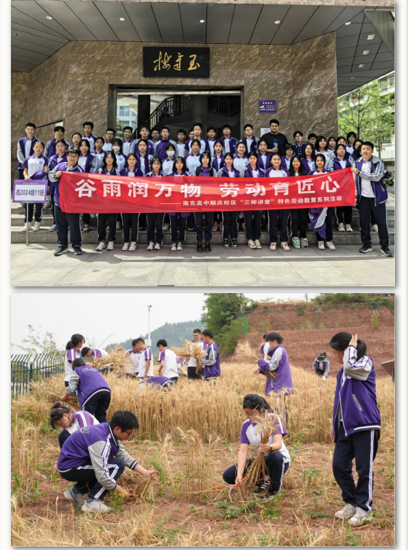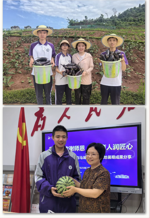 积极搭建劳动教育平台,丰富学生技能培养途径。每周组织一个班级学生走进南充中专开展“普职融合”劳动教育,参加数控、汽修、烹饪等技能培训;建成白马湖劳动实践基地,开发“节气+劳动”“科技+农业”校本课程,分批组织高一高二所有班级到田间开展“春华秋实”农事劳动,全年收获油菜籽、茄子、红薯等农产品1万余斤,由学生带回家烹饪或赠予教职工,实现“从田间到餐桌”的完整体验。