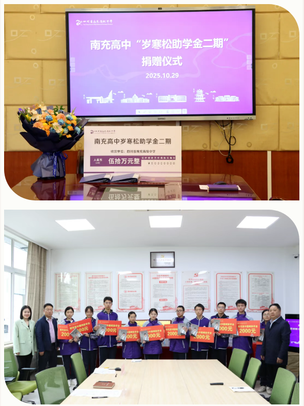 以爱心助学为抓手,积极联动校友、企业与社会各界力量,不断完善奖助学体系,鼓励帮助在校学子勤学奋进。2025年,顺庆校区校友发起的北京校友奖学金、辉武奖学金、国炯助学金、兴俊励志奖学金以及天府银行、建设银行、清心会、市红十字会等企业社会团体等奖助学项目共为107名学生发放奖助学金24.4万元。12月,64级4班一名老校友捐资50万元设立“岁寒松助学金二期”并完成首次颁发。校区全年共为709名学生发放各类奖助学金或减免学费总金额达114.149万元,学生感恩意识和奋斗精神得到增强。