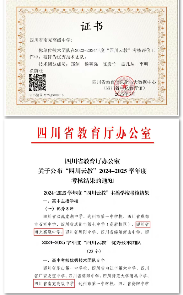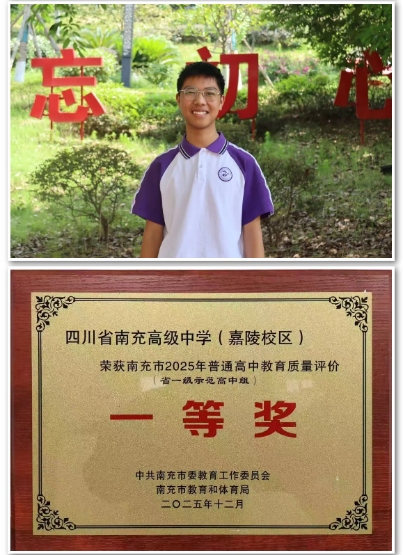在南充市2025年基础教育质量评价之高中教育学业质量维度评价中,嘉陵校区位居全市省一级示范校第一,荣获南充市2025年普通高中教育质量评价一等奖。