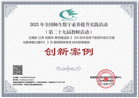 在南充市第二届青年教师风采展示之“教育共兴·优师领航行”活动中,7位教师入选并参与送教活动;在2025年四川省教师数字素养提升实践活动中,教师团队斩获省级大奖39项;校本研修案例《AI技术支持下的初中语文文言文能力提升》获国家级创新奖。省市级课题结题20个、在研和立项课题36个;教学论文发表102篇,其中核心期刊11篇;出版教育教学专著1部。