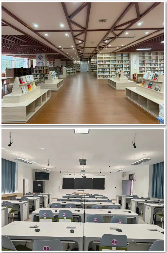 完成图书馆升级改造,科学重构借阅、阅览、研讨等功能区域,更新阅览桌椅与书架设施;推进多功能电教室改造,优化空间布局与设备配置,升级多媒体教学系统、音响及电脑设备;打造集授课、研讨、录直播于一体的现代化教学场景,为优质课程传播与教学质量的提升筑牢基础;精准落实网链共享计划采购项目,新建“网链共享计划”直播教室8间,改造升级4间。