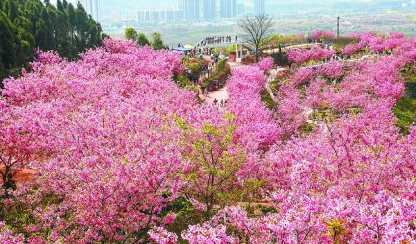 该景区以“四季花海、江景融合、主题体验”为核心,当前正值其最富魅力的春日樱花季。400余亩牡丹樱、粉红佳人樱花等品种正次第盛放,灿若云霞。漫步于沿山脊蜿蜒、临江铺开的观光花道上,游客不仅能沉浸于樱花烂漫的花海之中,还能同时欣赏到沿途点缀的梅花、虞美人及彩色油菜花,体验“一步一景”的视觉盛宴。据悉,本次樱花季预计将持续至3月中旬。