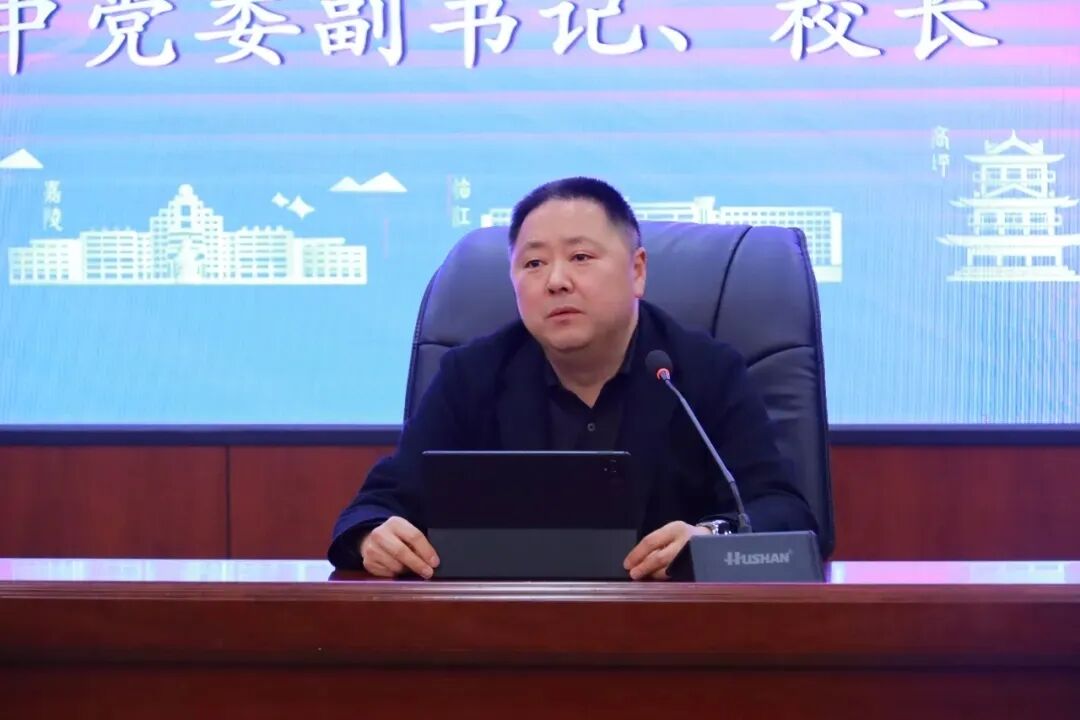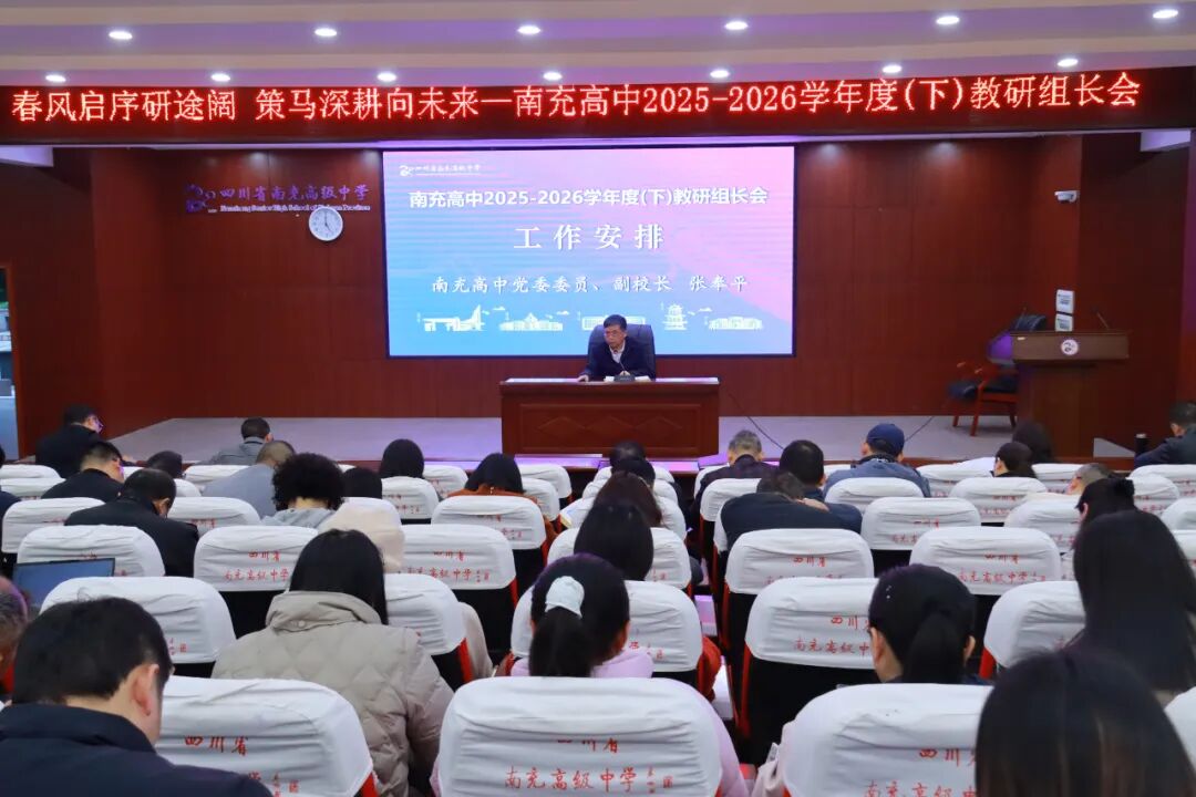 春归万物苏,策马启新程。为凝聚教研智慧,明确新学期教学研究方向,赋能学校高质量发展,2026年3月13日下午,南充高中2025-2026学年度下学期教研组长会在嘉陵校区学术厅顺利召开。本次会议以“春风启序研途阔 策马深耕向未来”为主题,为新学期教研工作谋篇布局。会议由教科室副主任郭登攀主持,学校党委副书记、校长王尚明,党委委员、副校长张奉平出席会议,教科室主任、副主任,各学科教研组长及副组长齐聚一堂,共话发展。