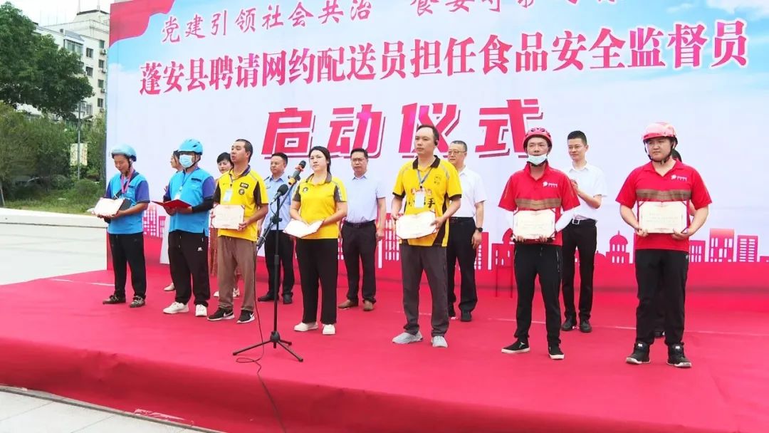 6月20日,蓬安县相如广场上,100名身着红、黄、蓝各色工装的外卖骑手庄严接过“食品安全监督员”聘书。这标志着南充市“党建引领+骑手参与+社会共治”食品安全监管新模式正式启航,首批“流动哨兵”在蓬安率先上岗。市市场监管局领导唐劲松现场宣布试点工作启动,蓬安县副县长孙超出席。来自市县相关部门、平台企业、餐饮商户及骑手代表共230余人参加活动。