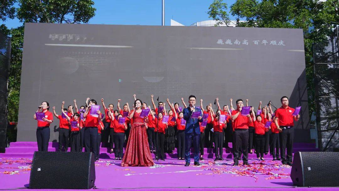全体老师手持校旗合唱《凤凰花开的路口》,将不舍与祝福融入歌声。