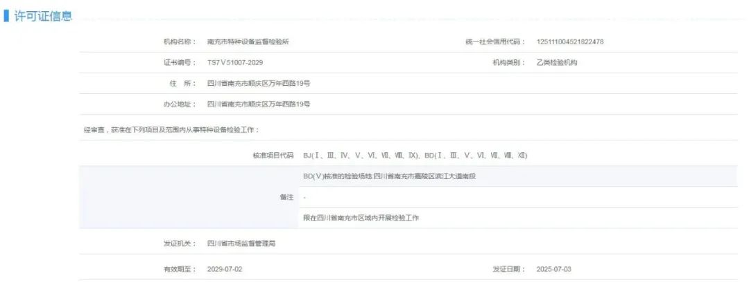 近日,经四川省市场监督管理局核准,南充市特种设备监督检验所一举成功获得多项特种设备检验检测资质,为南充市特种设备安全保障注入强劲动力。