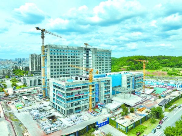 南充新闻网讯(杨波 文/图)7月10日上午,笔者走进国家区域医疗中心重点项目——首都医科大学附属北京安贞医院南充医院·南充市中心医院(下称“北京安贞医院南充医院”)建设现场,只见吊塔起落间转运建材,建设者各司其职,玻璃幕墙、医疗专项和消防、暖通、水电等安装工程同步推进。