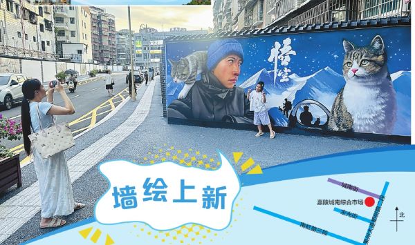 从都尉路一走进嘉陵区城南街,便看见“悟空”趴在墙边,一双亮汪汪的眼睛明亮动人,触动人心,引发无声的情绪共鸣。“进入城南街,就一定会被文化墙上的墙绘图案所吸引,‘悟空’或是慵懒地晒着太阳,或是灵动地观察着四周,其栩栩如生的神态实在是太萌了,让人不禁拍照留念。”市民何姗告诉记者,文化墙上通过多幅画面,讲述了一个雪原上“一人一猫”的骑行故事。故事被绘上街头围墙,给人带来一份藏在市井中的小温暖、小惊喜。