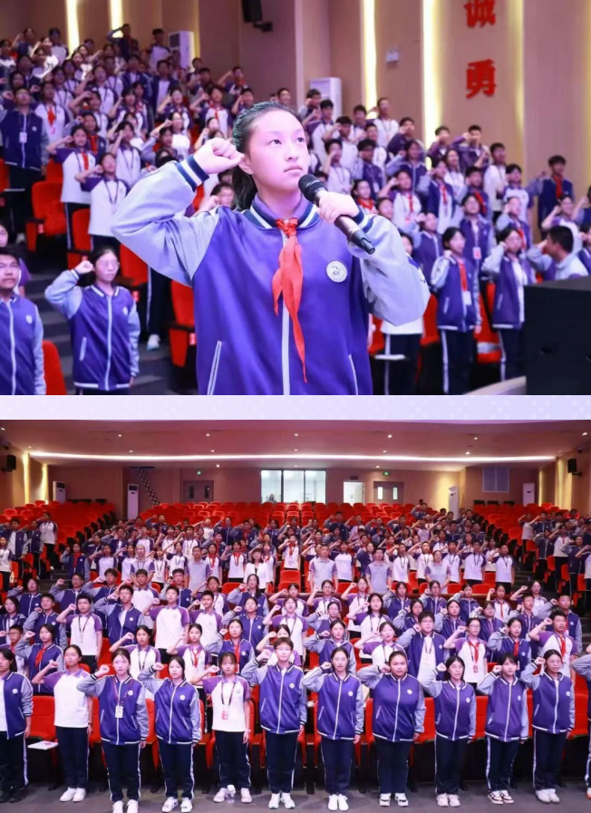 在少先队大队长谢佳颖的带领下,新一届学生组织成员进行了集体宣誓。铿锵有力的誓言回荡在会场,展现了同学们服务校园、锻炼自我的坚定决心。