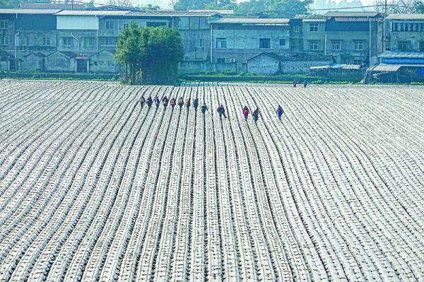 走进蓬安县锦屏镇中坝社区,一排排土垄横平竖直、整整齐齐,覆盖着白色地膜的地块如同铺展开的“银毯”。数十名村民分散在其间,正熟练地进行覆膜、勾苗等作业。