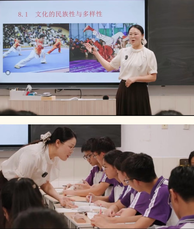 徐方萍老师则以“武术与街舞” 为趣味话题,与同学们共同探讨高中政治必修四第三单元第八课第一框 “文化的民族性与多样性”。她采用议题式教学模式,通过创设鲜活议题情境、设置分层议学任务、组织小组合作研讨等方法,将本课抽象知识层层拆解、逐步递进。徐老师坦言:“准备赛课资料的过程,是对教材内涵、学情特点、教学方法的重新梳理与深化。当看到学生在我的引导下主动探究、踊跃发言,我真切感受到:好的课堂从不是教师的‘独角戏’,而是师生共同搭建的‘思维共鸣场’,这也让我更坚定了深耕课堂、创新教法的决心。”