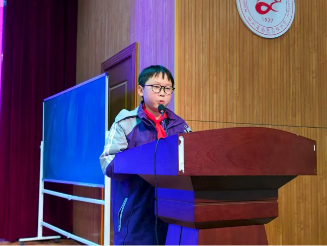 初一11班蒋昊廷同学作为获奖代表发言,分享了在品德修养与学业成长中的感悟,朴实真挚的话语传递出榜样的力量。