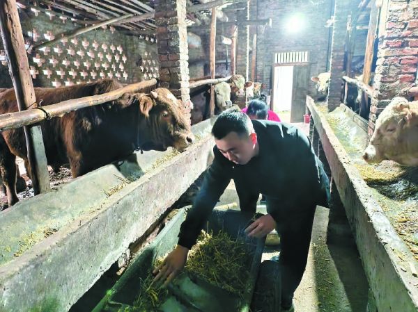 响水滩村驻村第一书记胡红东帮养殖大户喂牛。